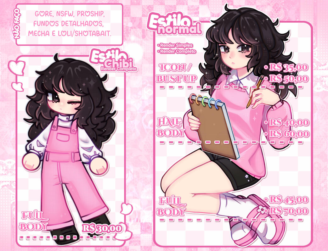- Informe se o pedido vai ser usado para fins comerciais ou pessoais.2. Pagamento:➜ O pagamento deve ser realizado antes de qualquer produção. O serviço não se dará início antes disso.- Apenas pagamentos através de: Ko-fi, PayPal e Pix.